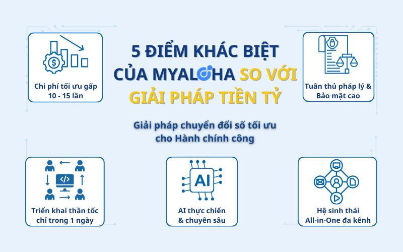 Myaloha mang đến sự khác biệt từ tư duy sản phẩm đến mô hình triển khai. Không đi theo lối mòn của các dự án phần mềm truyền thống tốn kém và kéo dài. Dưới đây là 5 điểm khác biệt cốt lõi giúp Myaloha vượt trội hơn so với các giải pháp "tiền tỷ" trên thị trường. Các cơ quan nhà nước và tổ chức đang tìm kiếm sở hữu một hệ thống công nghệ hiện đại, đáp ứng tiêu chuẩn khắt khe mà không phải chi hàng tỷ đồng ngân sách?