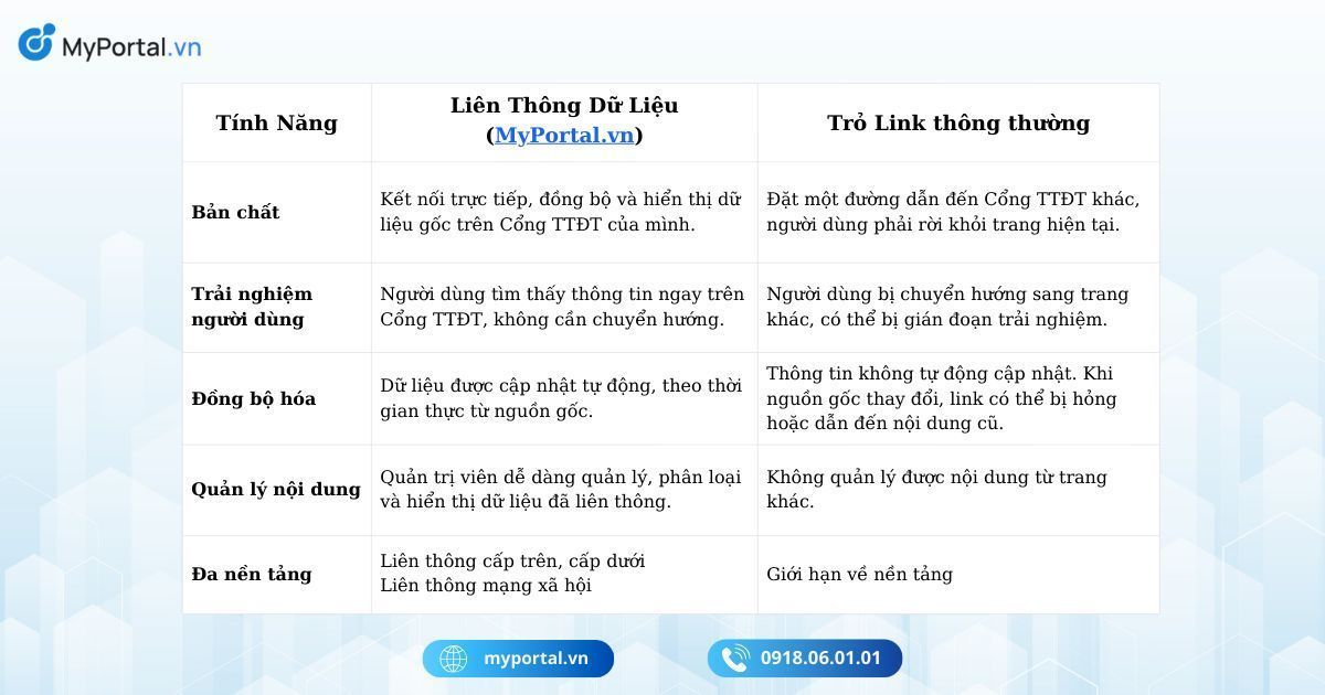 Có thể thấy, tính năng liên thông dữ liệu Cổng TTĐT của MyPortal.vn mang lại sự đồng bộ, liền mạch và trải nghiệm người dùng vượt trội mà "trỏ link" không thể sánh được.